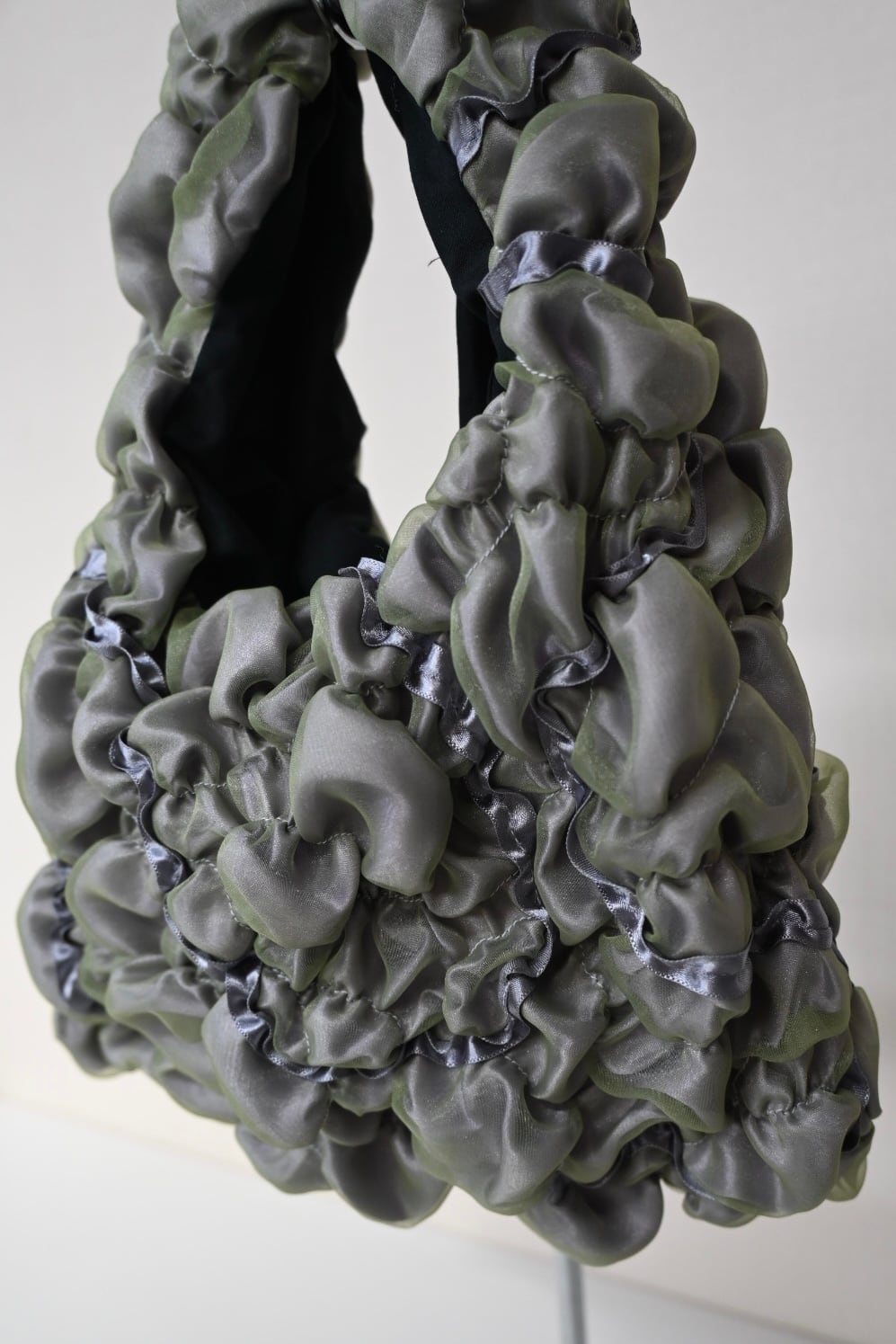 サテン生地の上にオーガンジーを重ね、ゴムシャーリングで形を作っています。