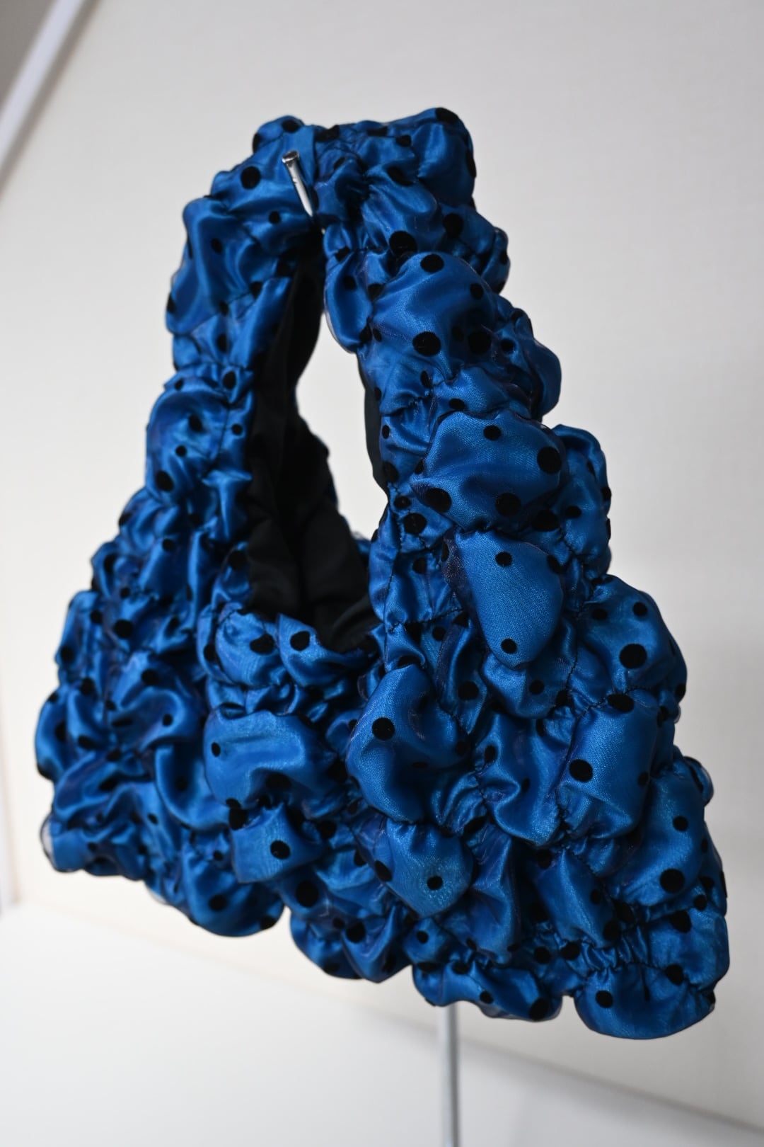 サテン生地の上にオーガンジーを重ね、ゴムシャーリングで形を作っています。