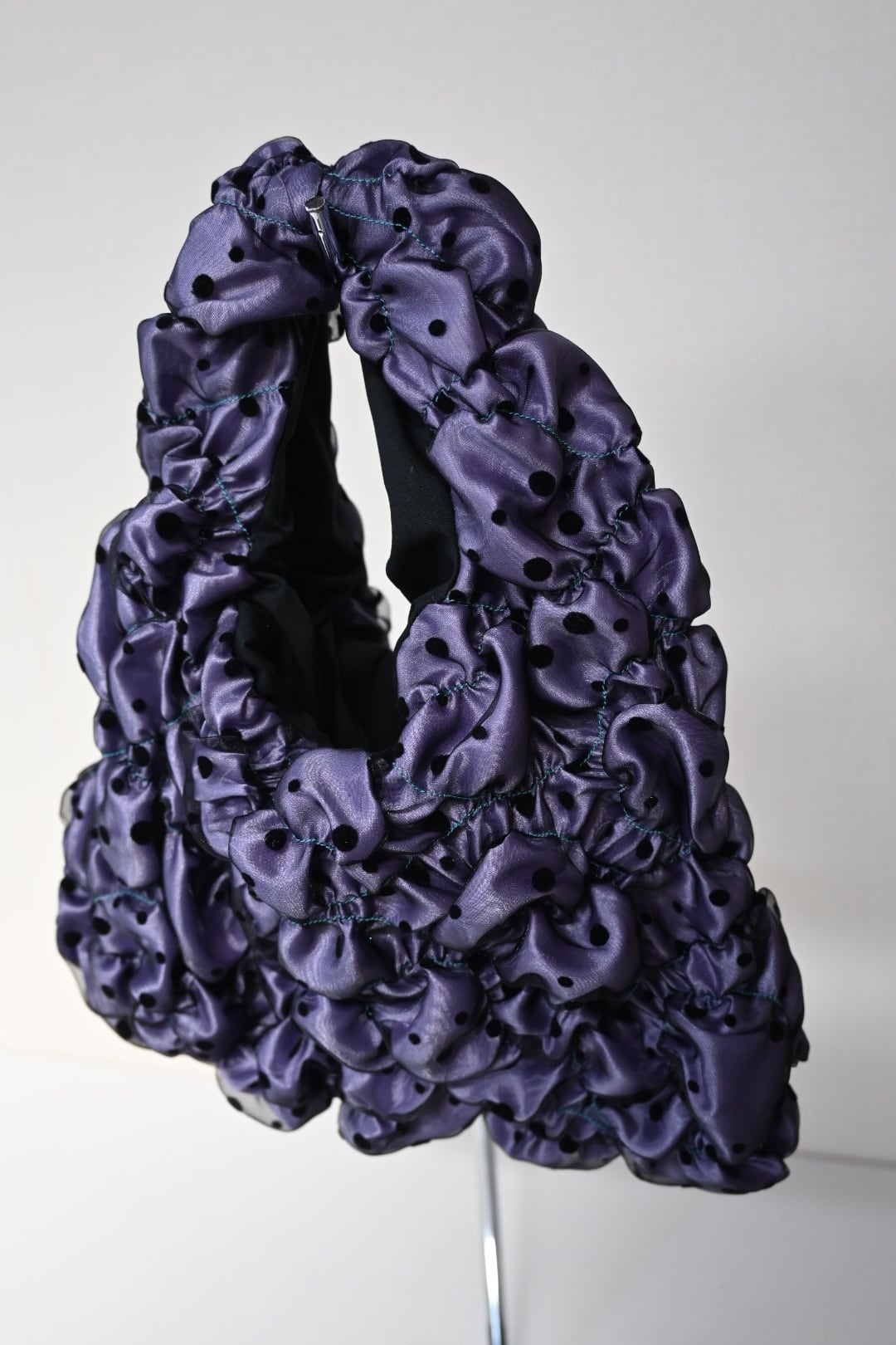 サテン生地の上にオーガンジーを重ね、ゴムシャーリングで形を作っています。