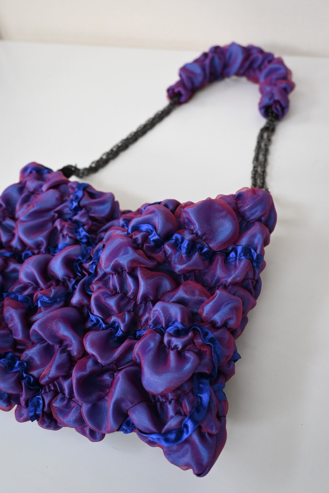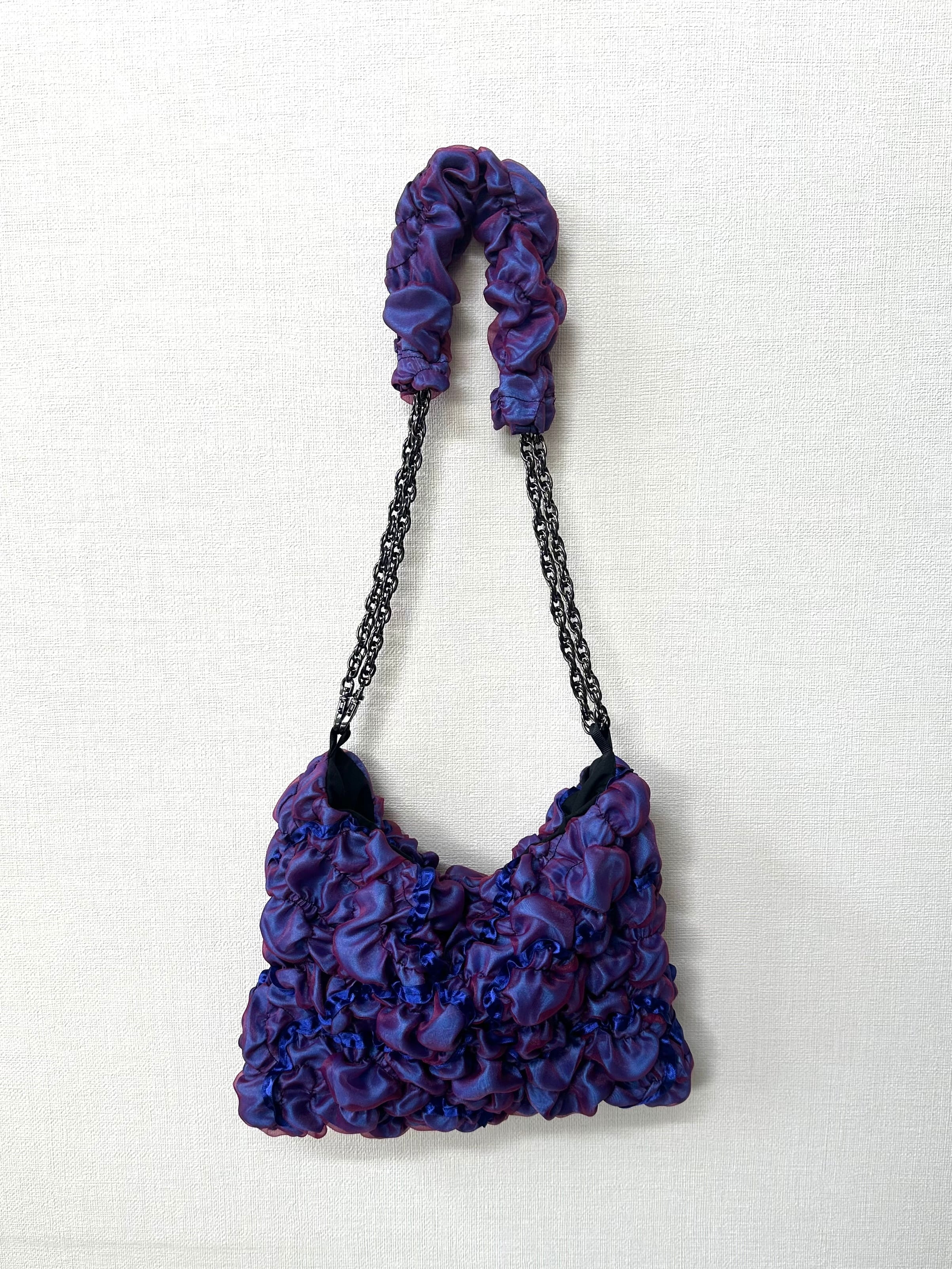 サテン生地の上にオーガンジーを重ね、ゴムシャーリングで形を作っています。