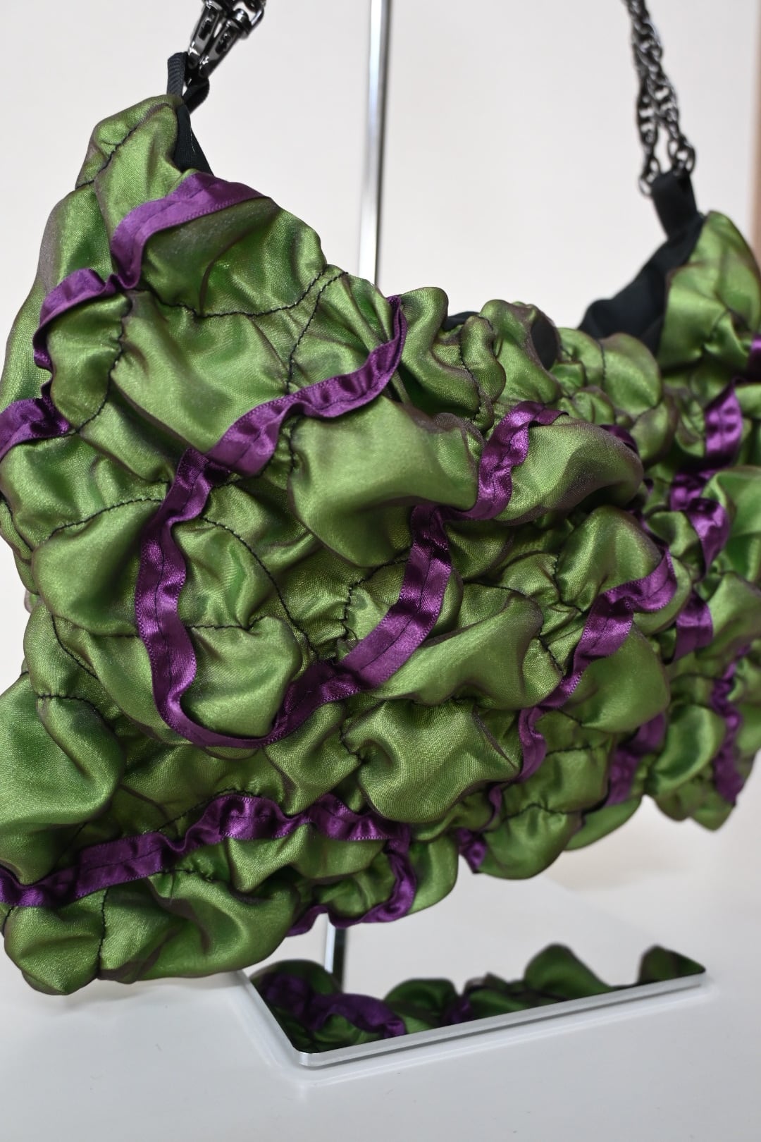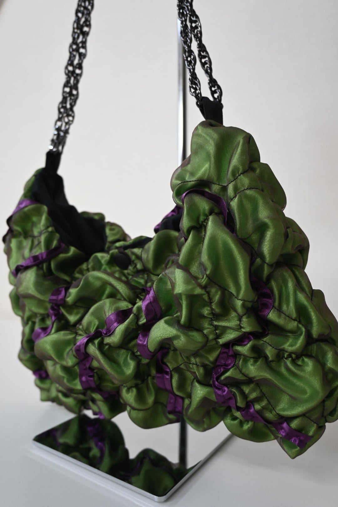サテン生地の上にオーガンジーを重ね、ゴムシャーリングで形を作っています。