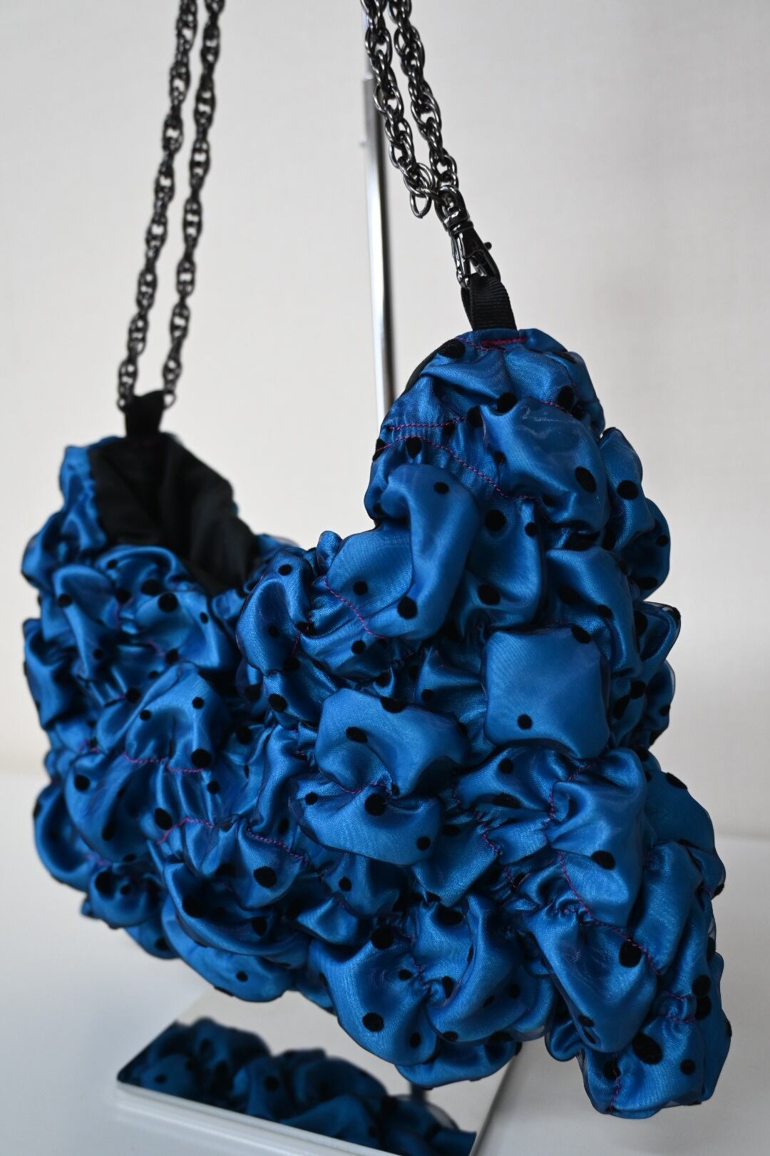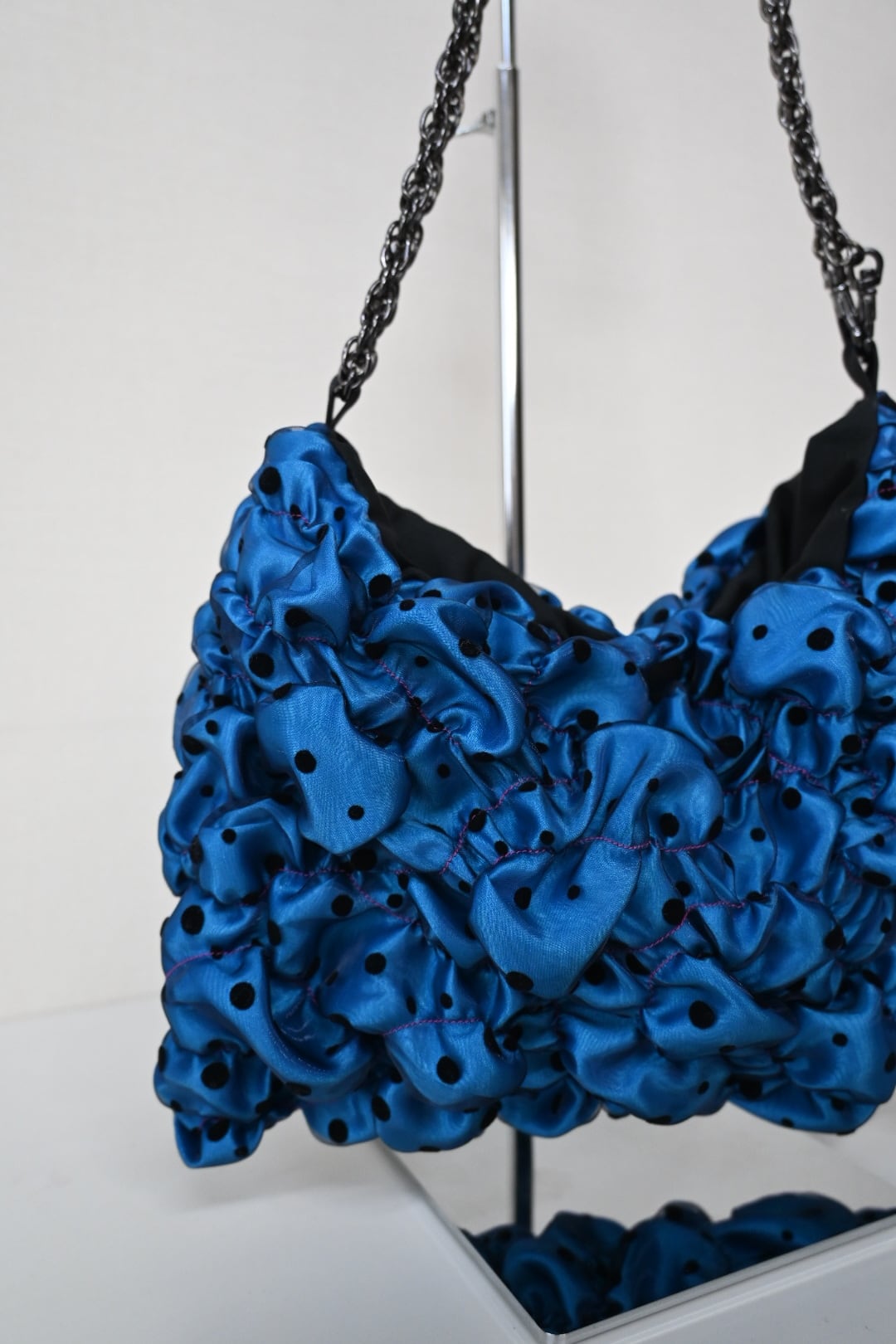サテン生地の上にオーガンジーを重ね、ゴムシャーリングで形を作っています。