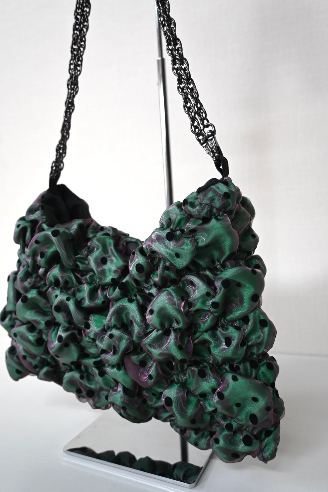 サテン生地の上にオーガンジーを重ね、ゴムシャーリングで形を作っています。