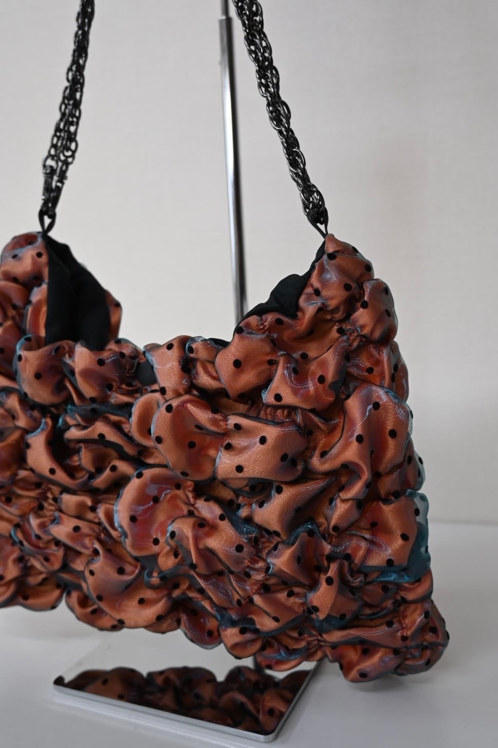 サテン生地の上にオーガンジーを重ね、ゴムシャーリングで形を作っています。