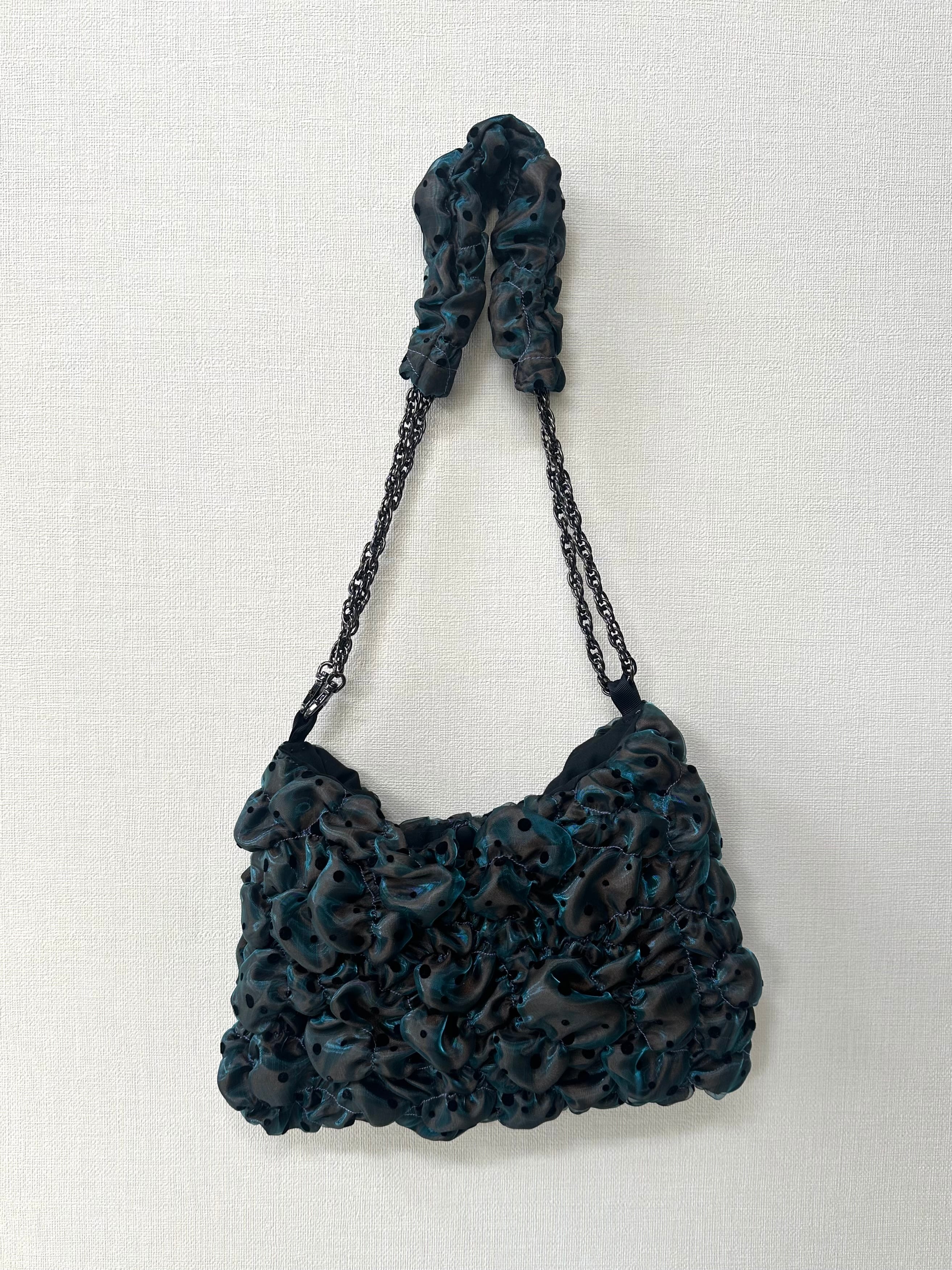 サテン生地の上にオーガンジーを重ね、ゴムシャーリングで形を作っています。
