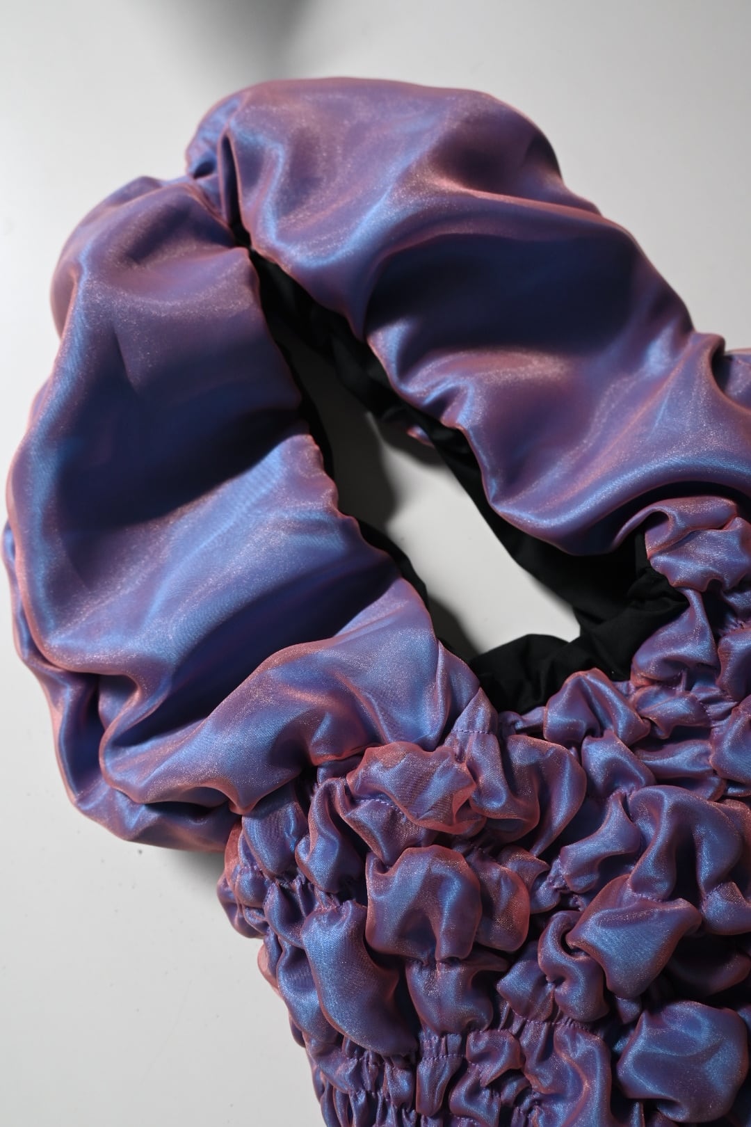 サテン生地の上にオーガンジーを重ね、ゴムシャーリングで形を作っています。
