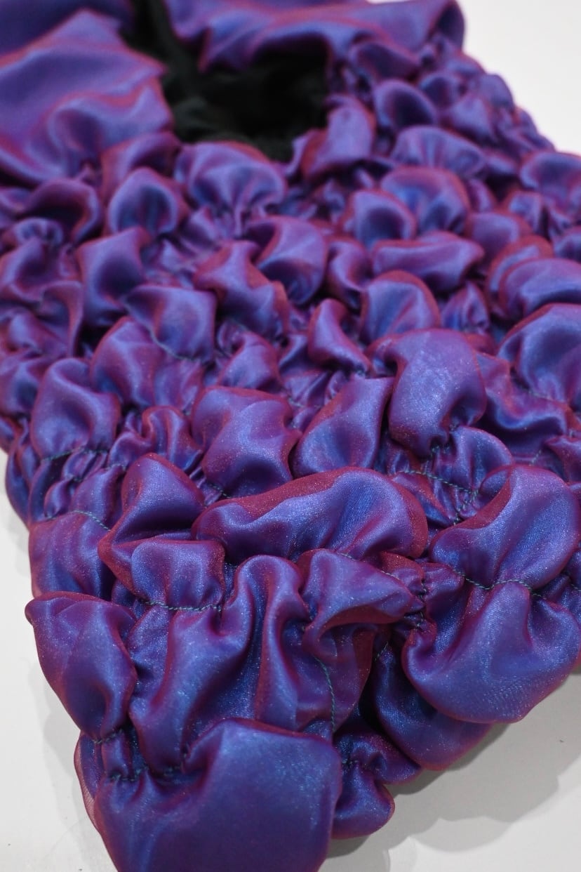 サテン生地の上にオーガンジーを重ね、ゴムシャーリングで形を作っています。