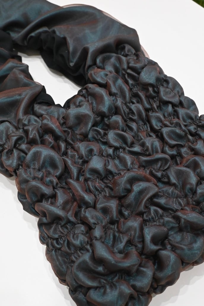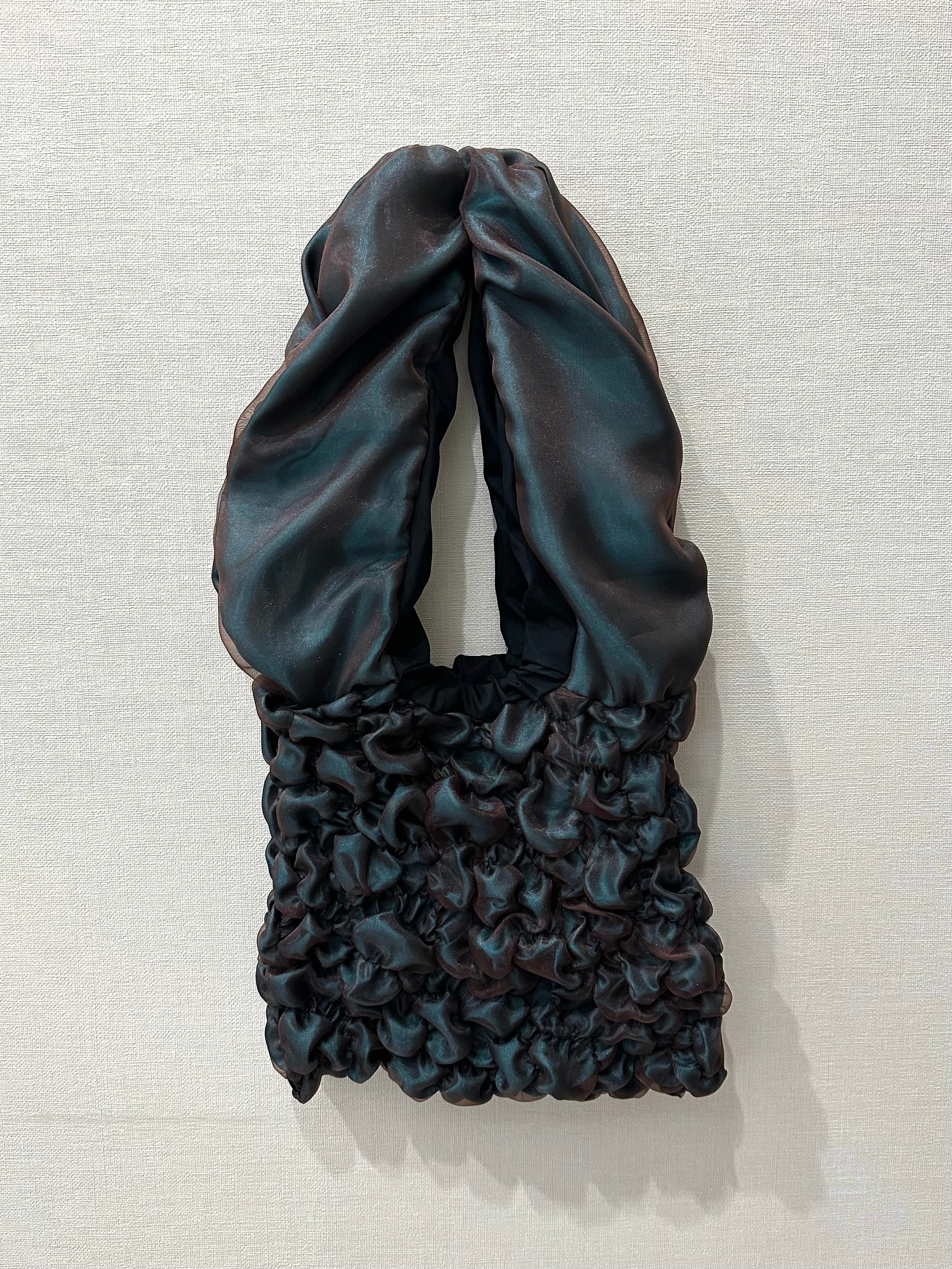 サテン生地の上にオーガンジーを重ね、ゴムシャーリングで形を作っています。
