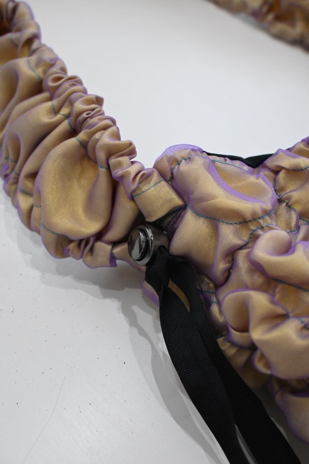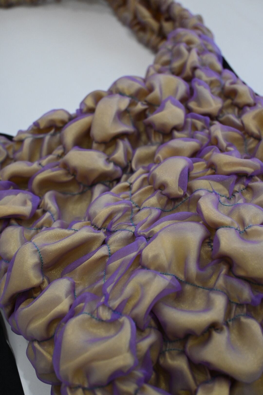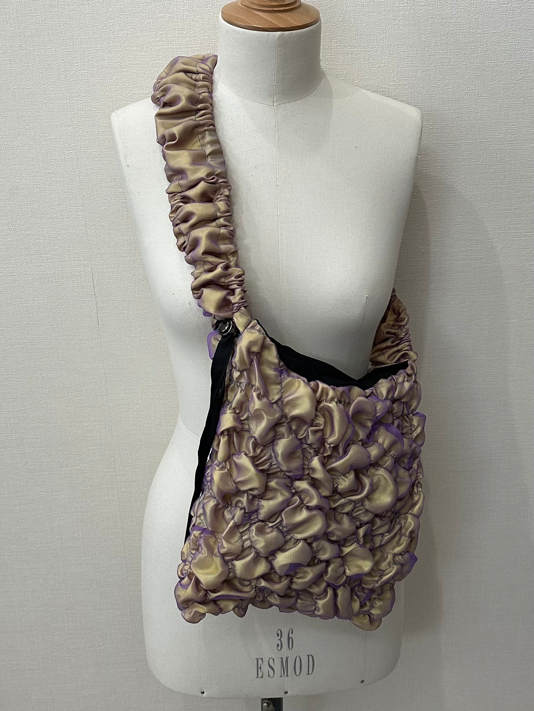サテン生地の上にオーガンジーを重ね、ゴムシャーリングで形を作っています。