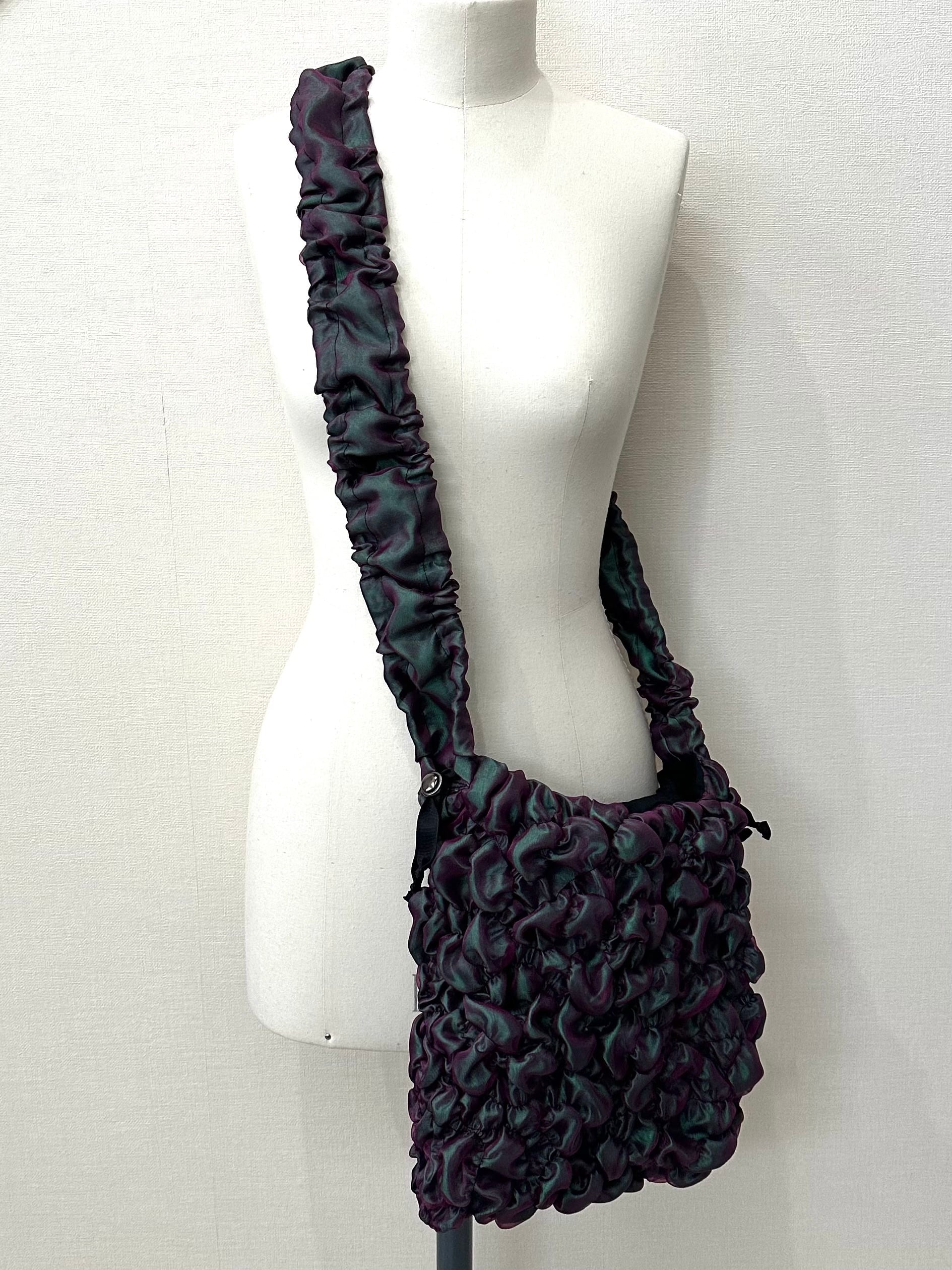 サテン生地の上にオーガンジーを重ね、ゴムシャーリングで形を作っています。