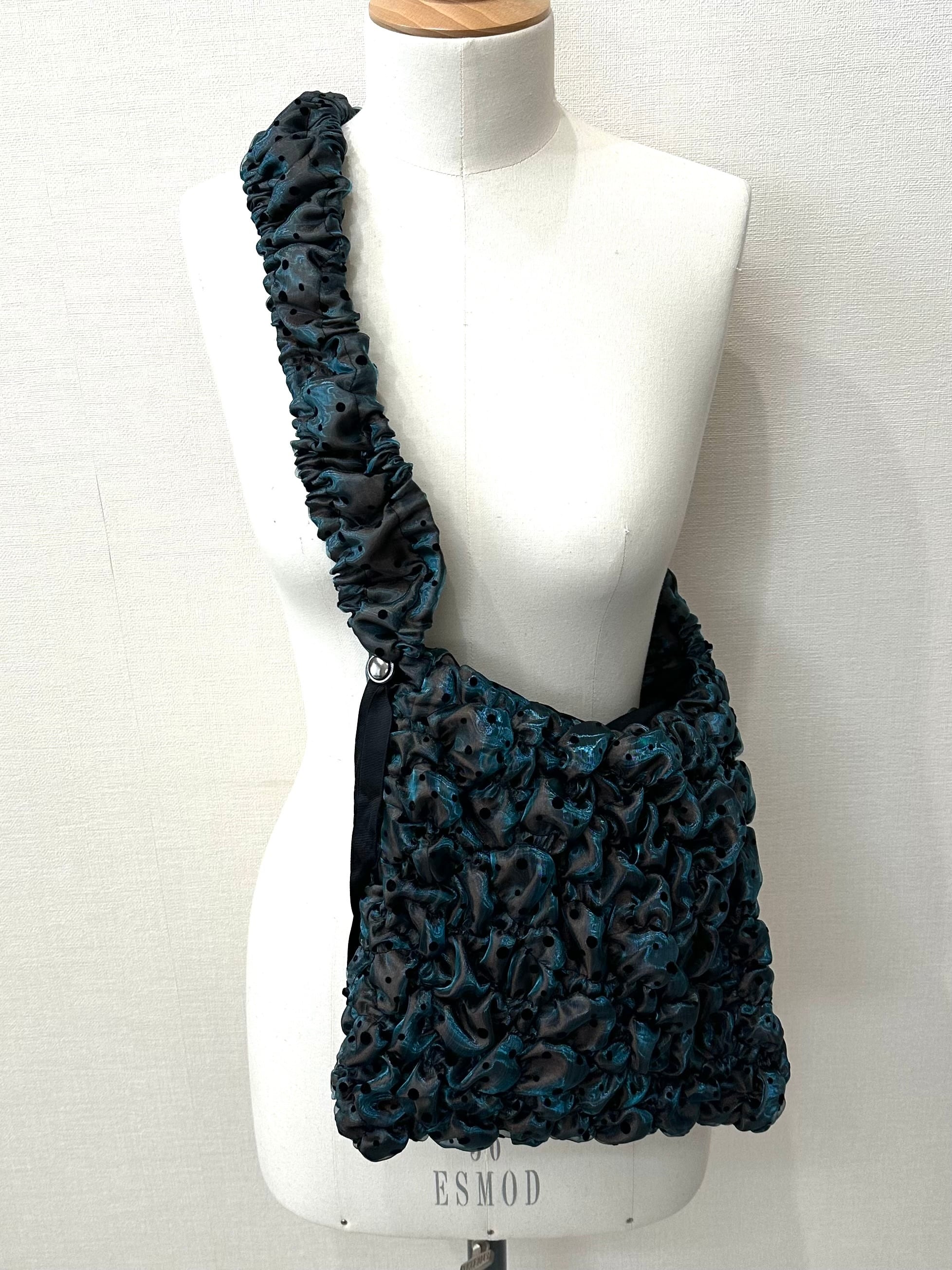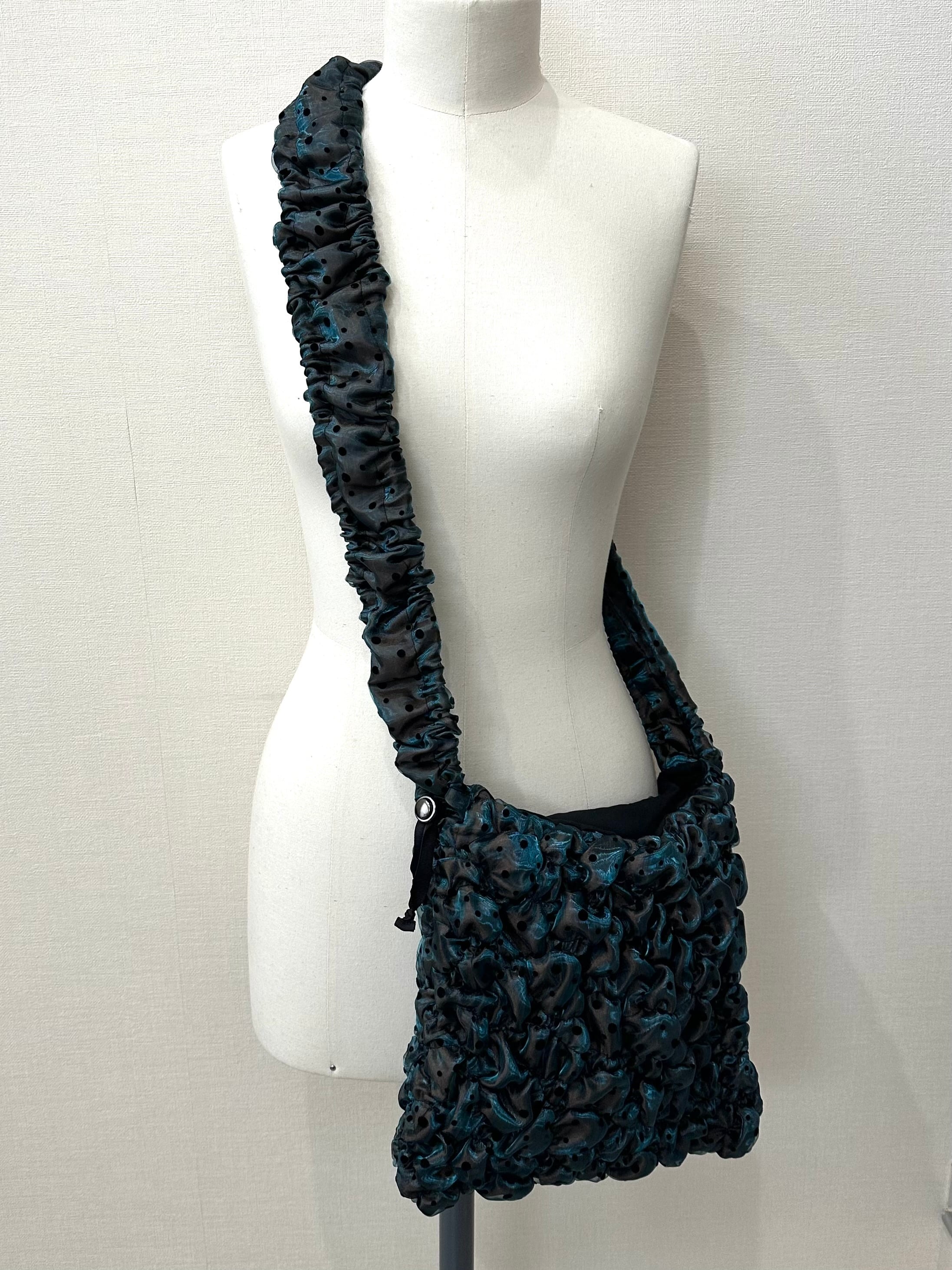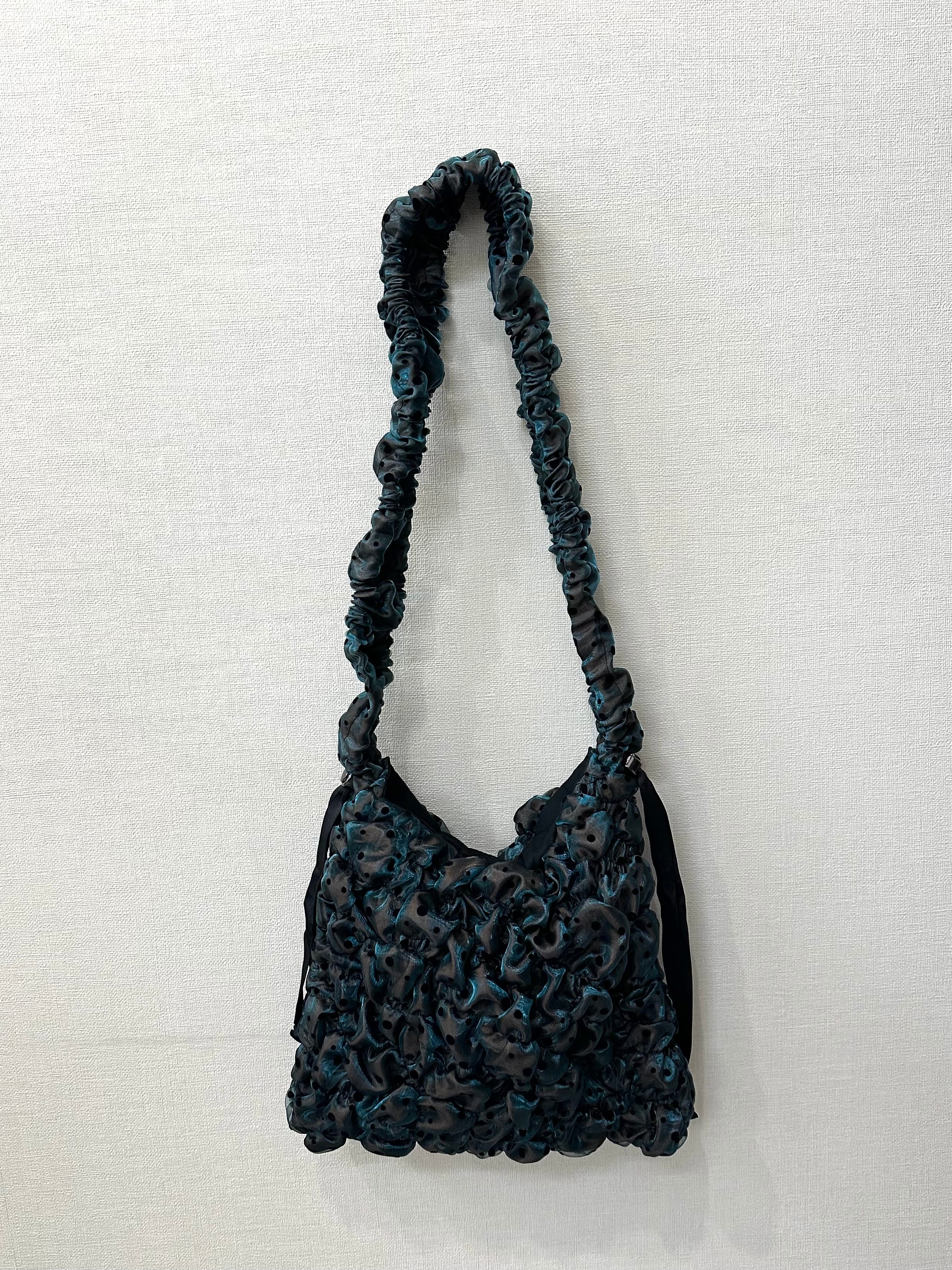 サテン生地の上にオーガンジーを重ね、ゴムシャーリングで形を作っています。