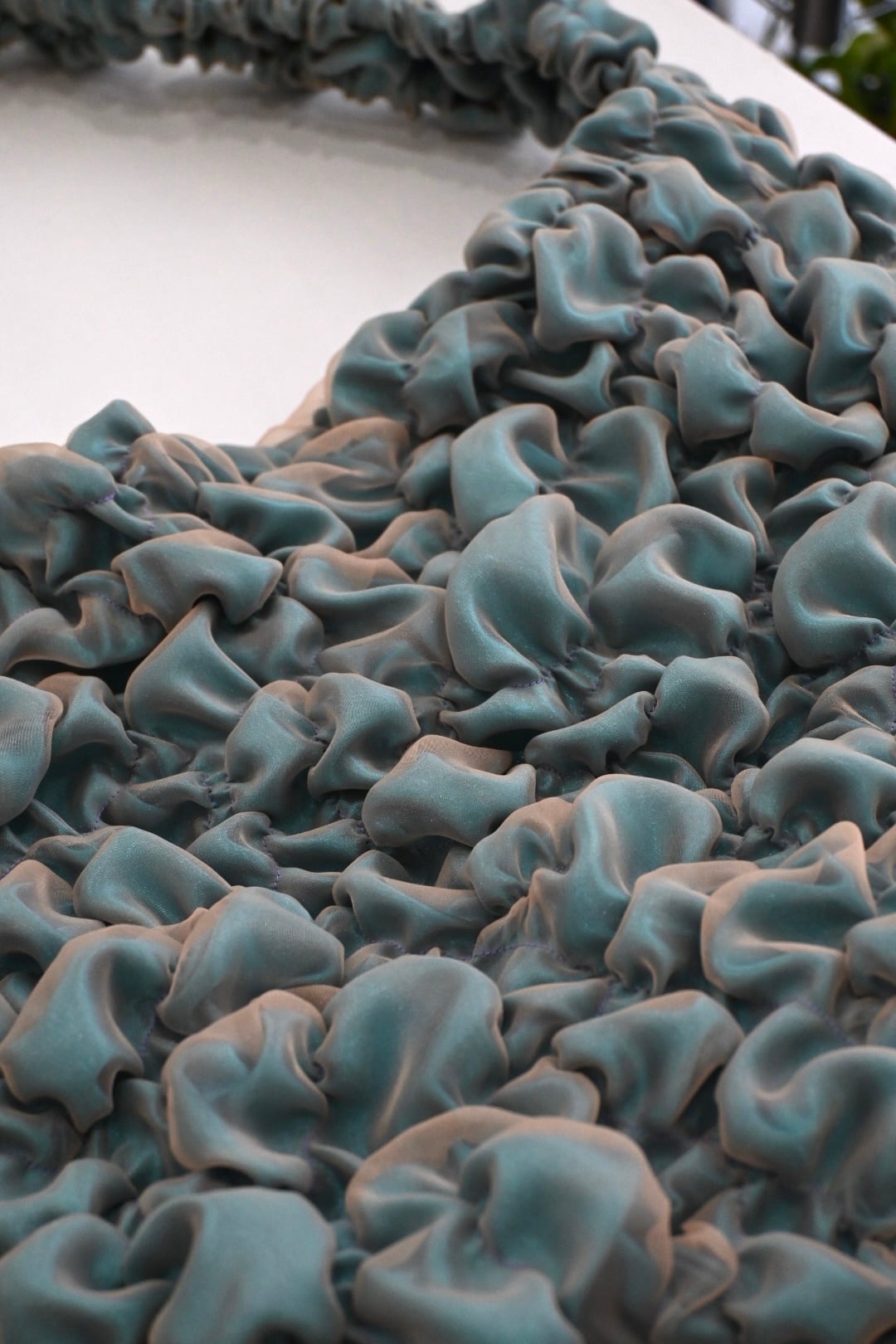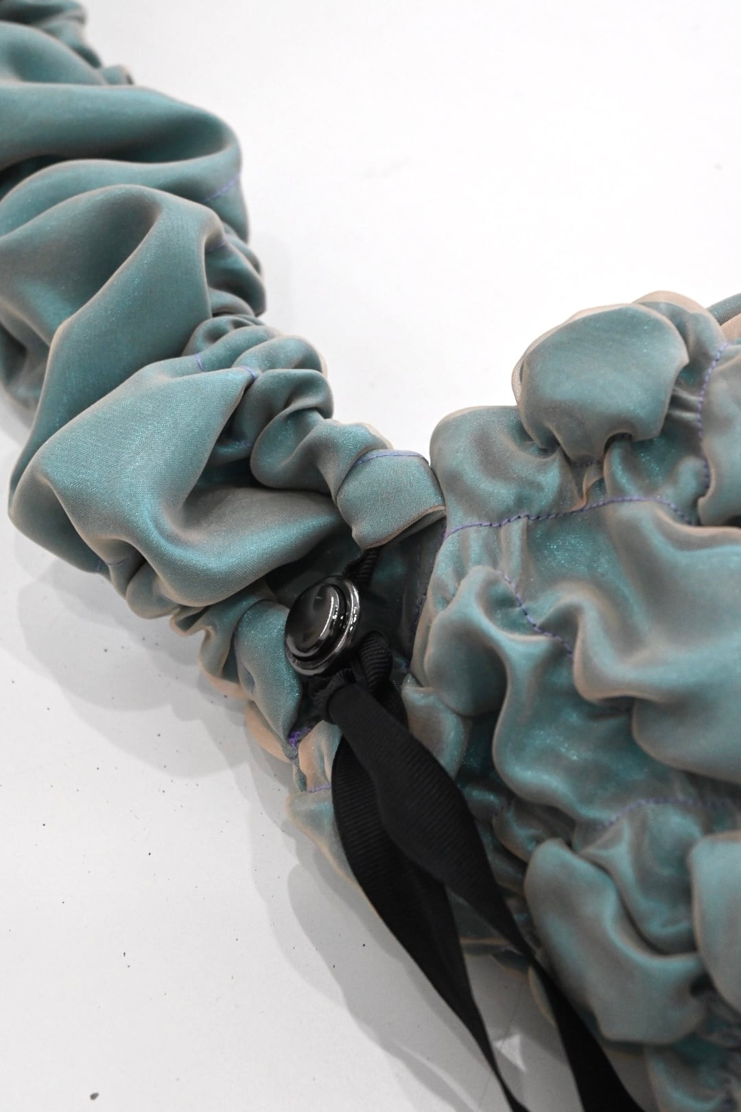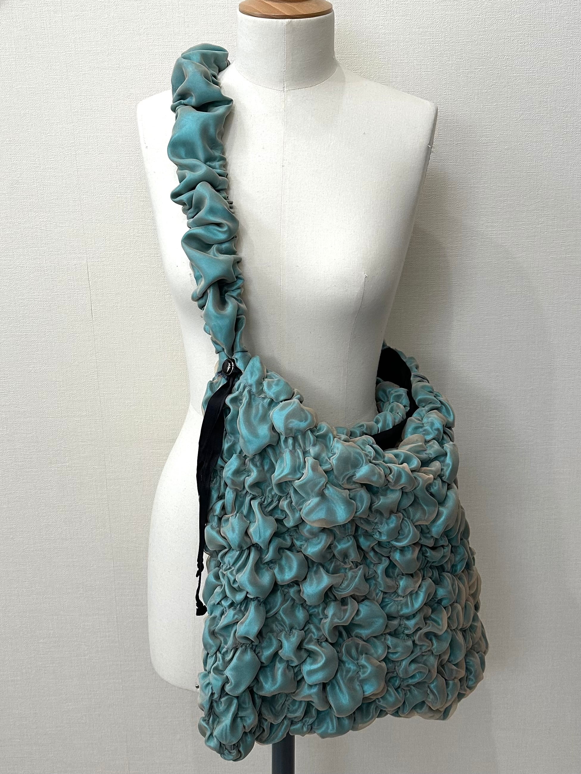 サテン生地の上にオーガンジーを重ね、ゴムシャーリングで形を作っています。