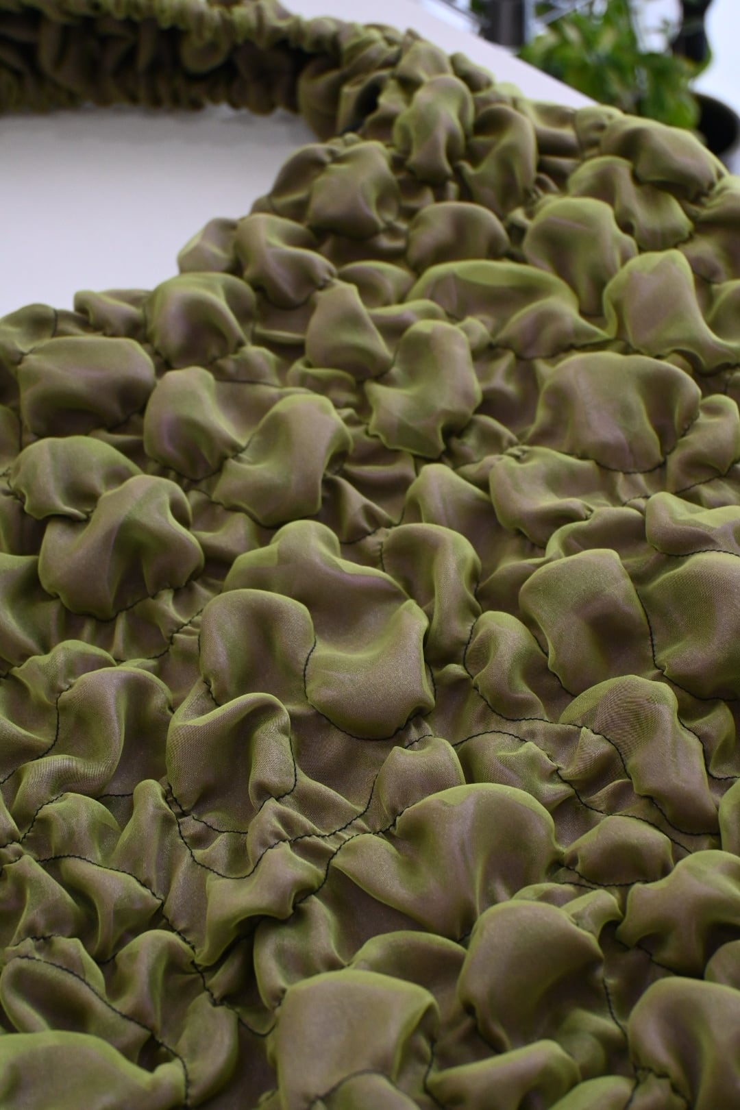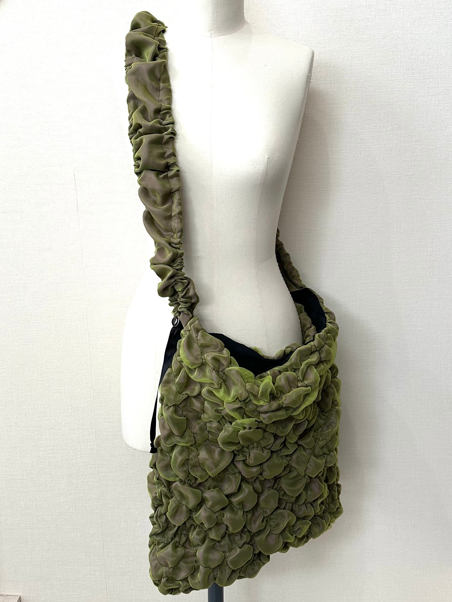 サテン生地の上にオーガンジーを重ね、ゴムシャーリングで形を作っています。