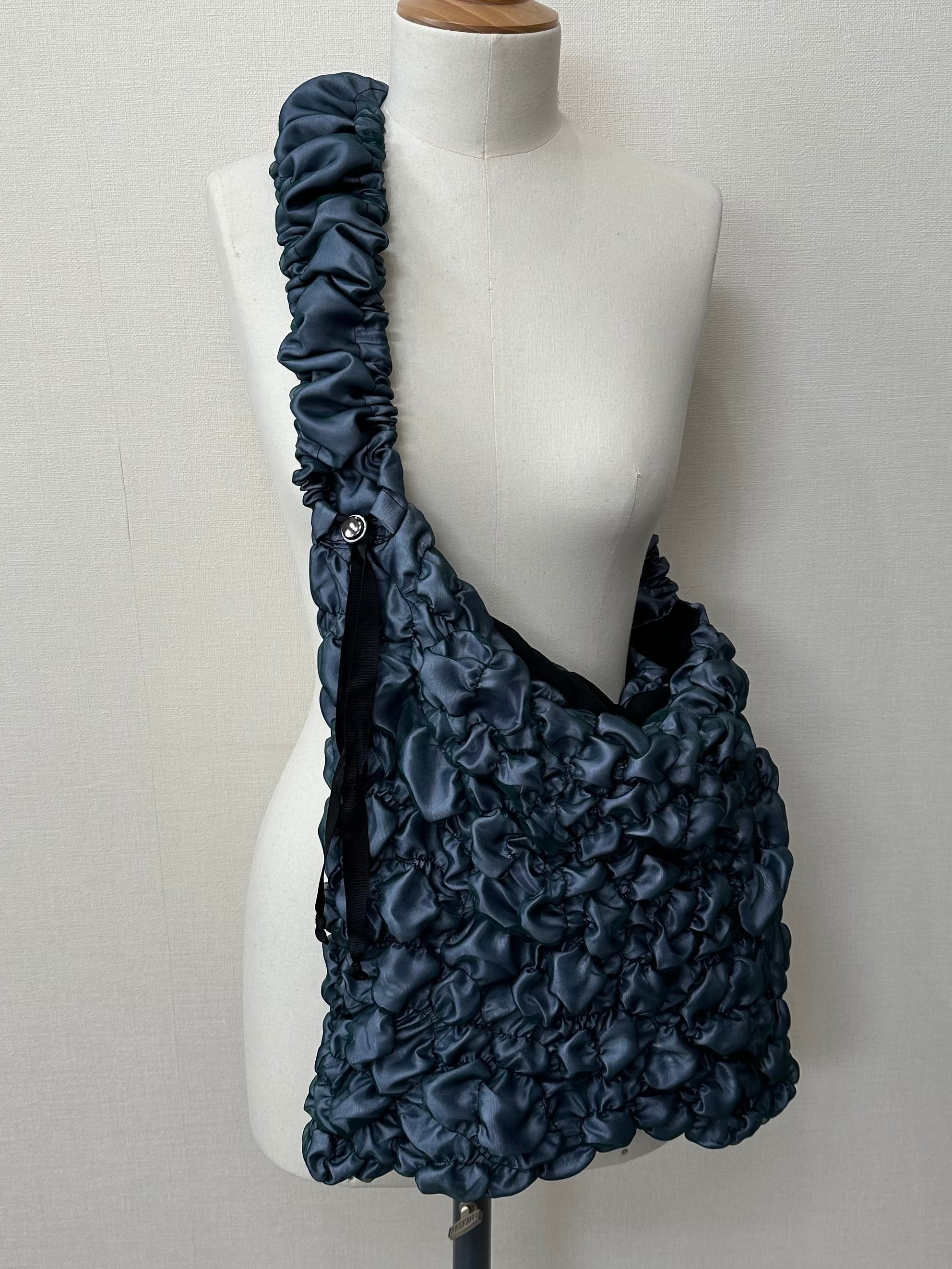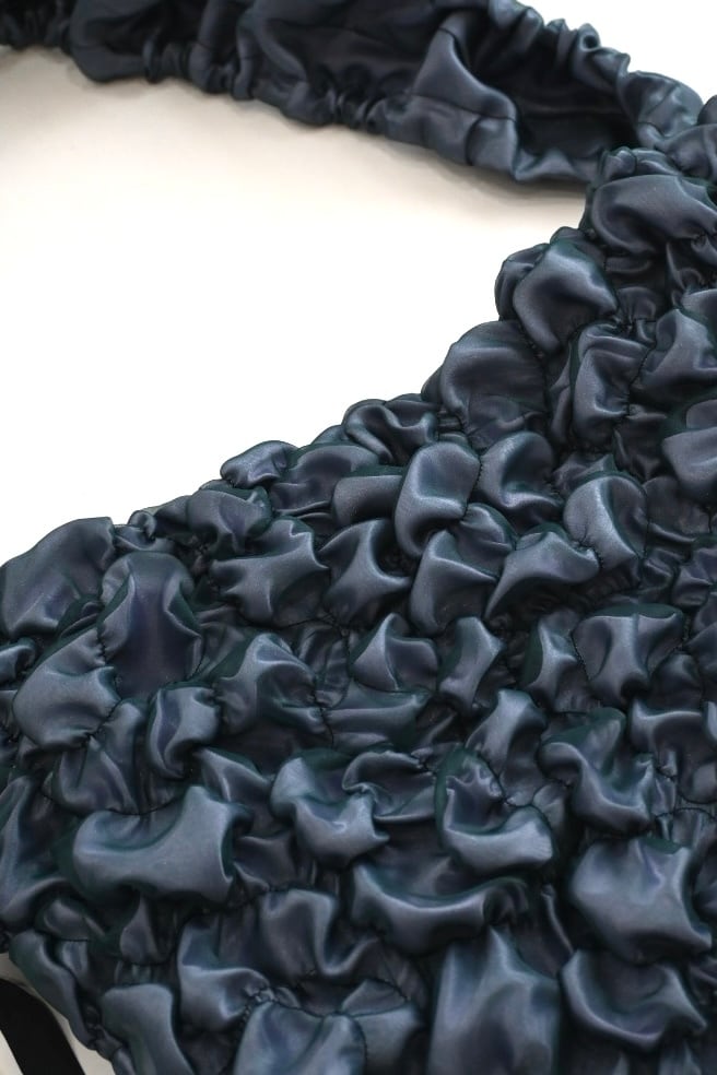 サテン生地の上にオーガンジーを重ね、ゴムシャーリングで形を作っています。