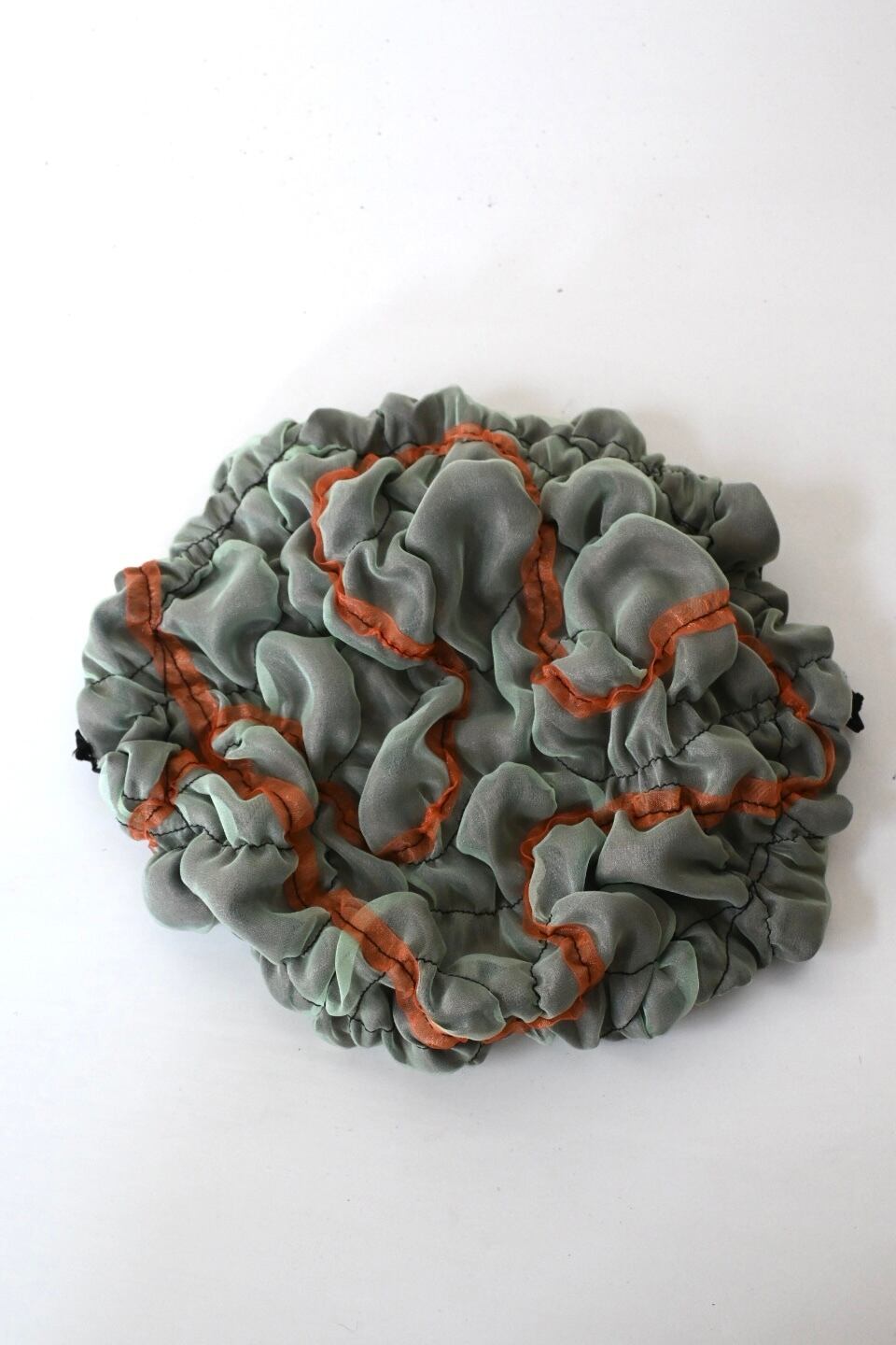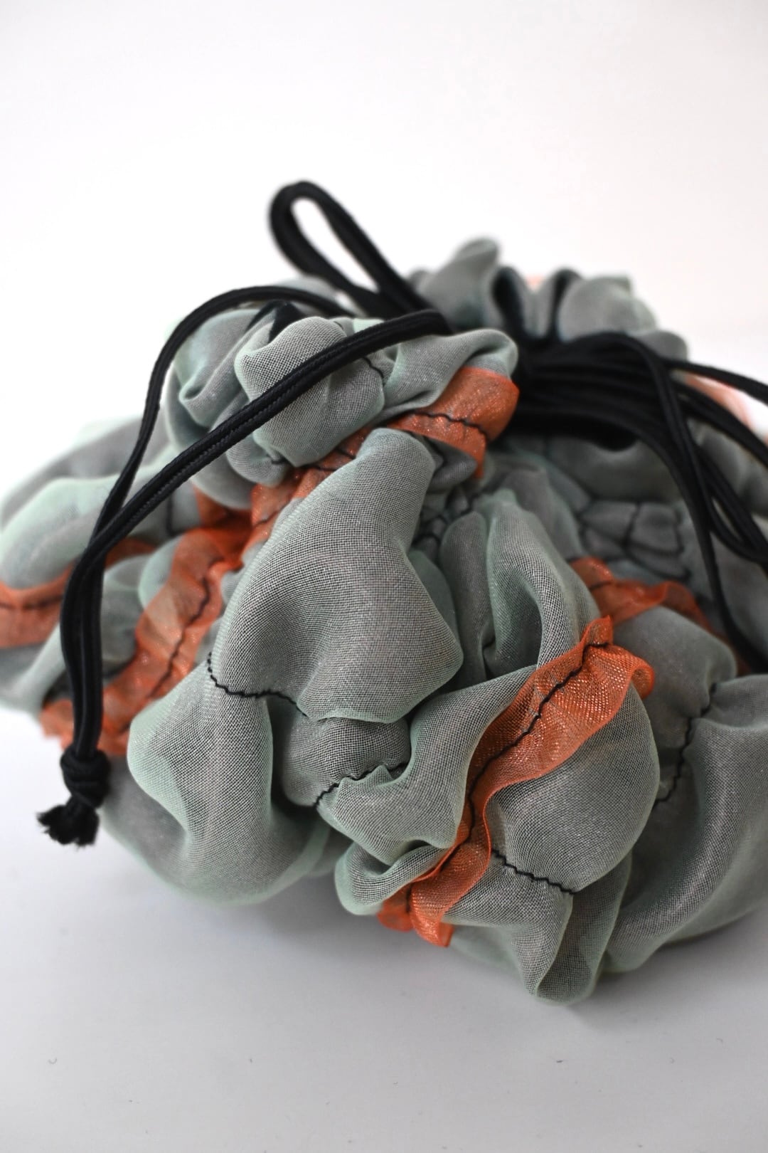 サテン生地の上にオーガンジーを重ね、ゴムシャーリングで形を作っています。