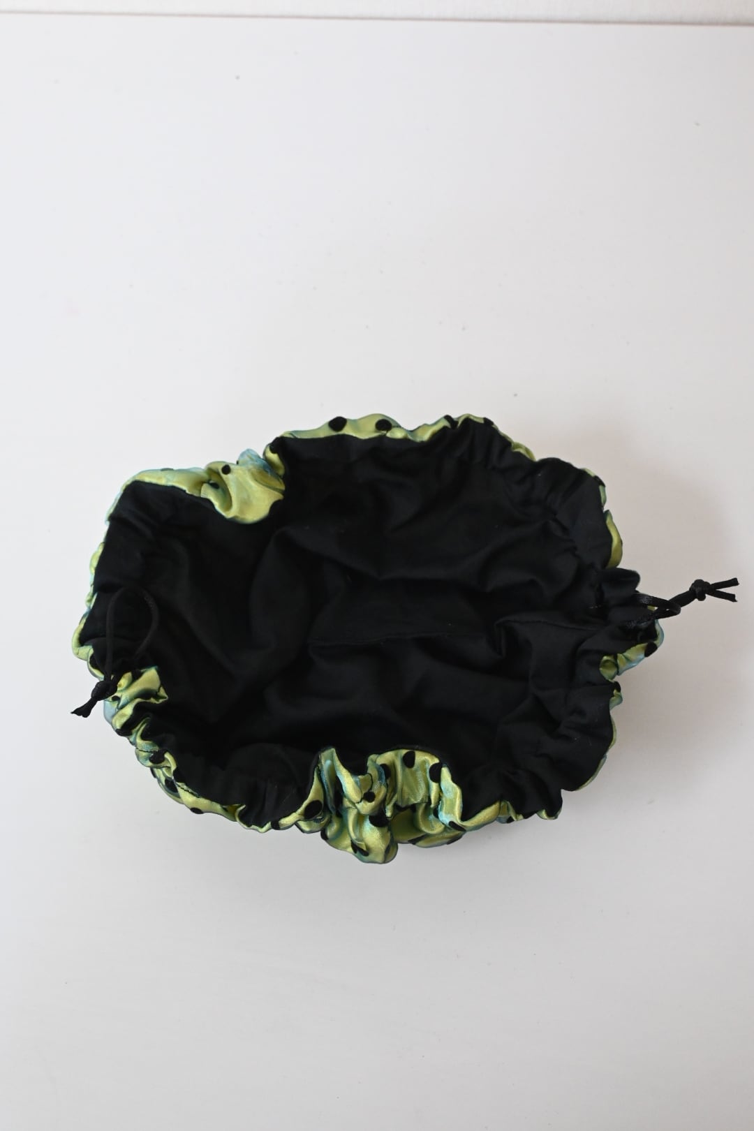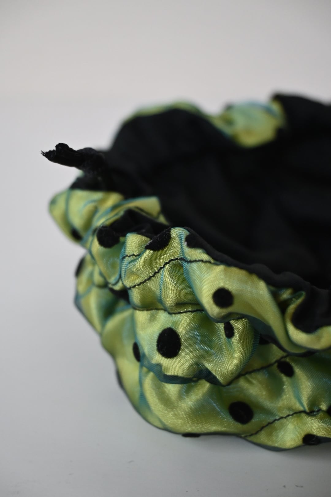 サテン生地の上にオーガンジーを重ね、ゴムシャーリングで形を作っています。